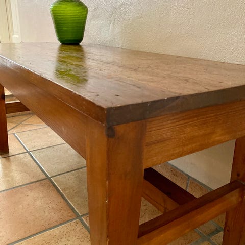 Massivt fyrretræ. Kraftige planker i bordpladen. Enkle, solide ben uden dekor. Sandsynligvis fra slut 70’erne højkvalitets serieproduktion fra mindre danske møbelhuse.