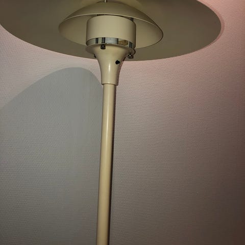 Lampen er multiindstillelig i såvel belysningsvinklen som højden. Højde optil ca 150 cm. Skærmdiameter ca 15 cm. God stand m. lette alderskarakteristiske brugsspor og patinering.
