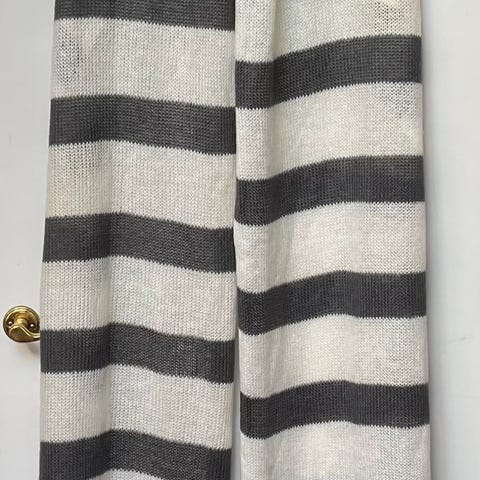 Råhvidt strikket tørklæde i blød let uld ca. 100 * 13 cm. Fremstår pænt og indbydende.