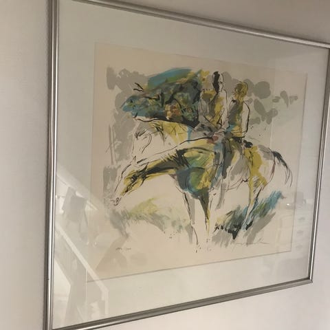 Indrammet kunsttryk med motiv af personer på heste i landskab. Trykket er i sort-hvid og indrammet med passepartout og grå ramme. Måler 53x103 cm ca