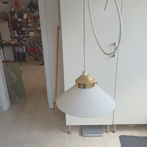 Lampen er monteret med ca. 2mtr. pæn rund hvid ledning og den originale fatning med perfekt aflastning.