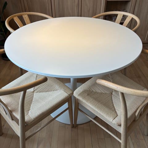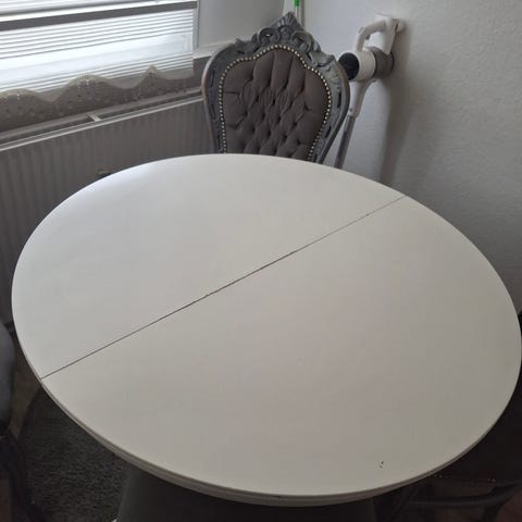 Fint rundt hvidt spisebord i god stand. Vi bruger det ikke så det skal videre og få et nyt liv hos en anden