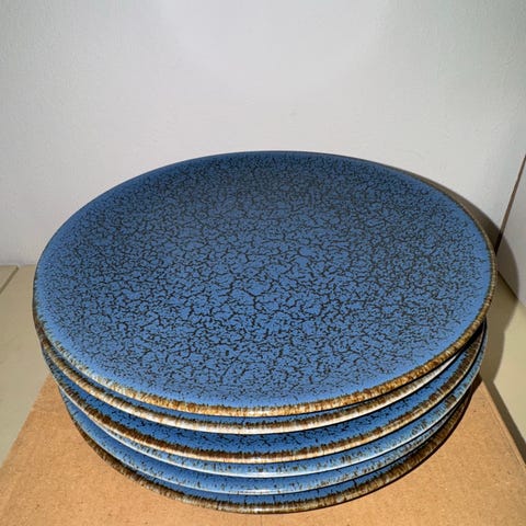 Farven er en flot blå/grå “speckled” glaze, som giver et moderne og stilrent udtryk. De er tunge, solide og perfekte som middagstallerkener.