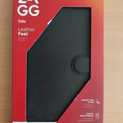 ZAGG Folio cover designet til Samsung Galaxy A35. Coveret har en læder-lignende finish og en slank profil. Det har også kort- og kontantlommer og en magnetisk lukning.