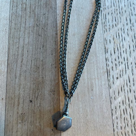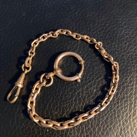 Kæden har et smukt antikt udtryk og naturlig patina. Et af leddene er i stykker (som vist på billedet).
