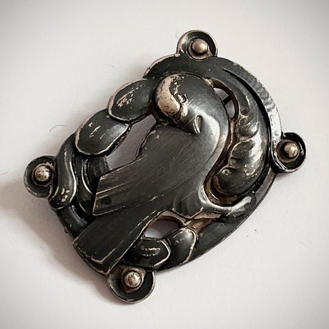 Den klassiske fuglebroche nr 123 fra Georg Jensen (dia 4 cm) og øreclips (dia 2 cm)