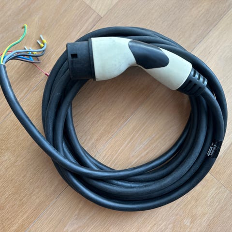 Ladekabel af type 2 til fast montering til ladeboks. Fabrikat: Johnson. Længde cirka 6 meter. Tre faser, 32A og 22 kW. Passer til de fleste ladebokse med fast kabel.