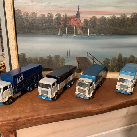 Tekno Volvo F89 lastbil legetøj i rød og grå farve. Modellen har en vippefunktion på ladet og detaljeret kabine. Fremstillet i metal og plast, velegnet til samling eller leg.