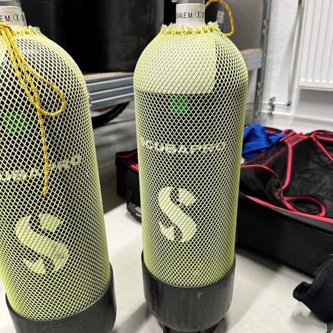 Sættet har været i Østersøen 4-5 gange. Skal trykprøves. Der gives 2 måneders garanti for bestået trykprøvning. Jeg giver 800kr tilbage pr. cylinder som beviseligt dumper til trykprøvning.