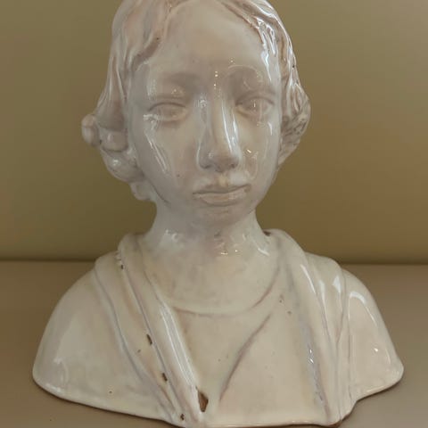 Sort ældre buste af barn i keramik, med sort glasur. Busten viser et smilende barn med lukkede øjne. Der er mindre skader og afskalninger på overfladen. Busten er cirka 15 cm høj og en signatur præget på bagsiden. Tror der står OR - se venligst fotos. Alder og oprindelse ukendt. Ved kun den er gammel. Har arvet den.