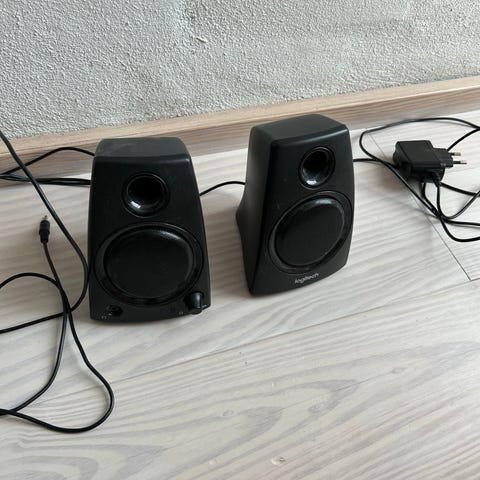 Logitech højttalere med ledning og 3,5 mm jackstik til tilslutning. Sort farve, kompakt design til brug med computere eller andre lydkilder med kompatibel udgang.