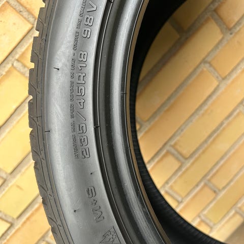 2 stk fra uge 17/24 med 8 mm mønster og to stk fra uge 15/21 med 5 mm mønster. De to ældste dæk har rejst sig lidt i mønstret, så de larmer lidt.