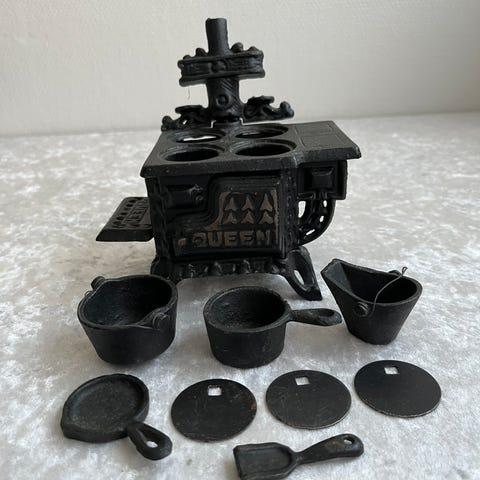 Legetøjskomfur i metal med røde detaljer. Farverne er primært hvid og rød.