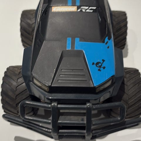 Forlygterne kan lyse gult eller blinke til den side, man drejer hjulene hen imod. Bruger 9V batteri i fjernbetjeningen og 3x AAA i bilen, som begge medfølger.