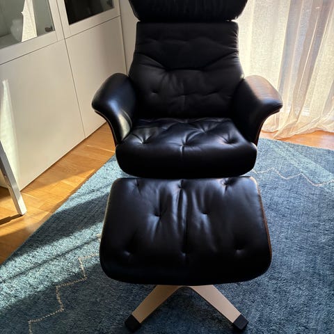 Fin lænestol med fodskammel i brun læder. Stolen befinder sig i Sundby.