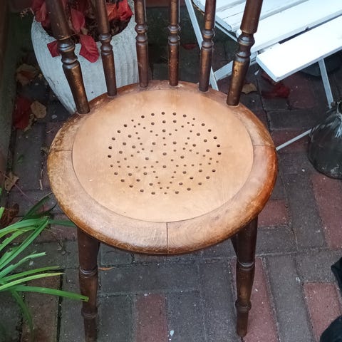 Blå træstol med rund sæde. Stolen har et dekorativt ryglæn og en rund, lys træplade som siddeplads. Velegnet til brug som spisebordsstol eller ekstra siddeplads i hjemmet. Sæde højde 47 cm.