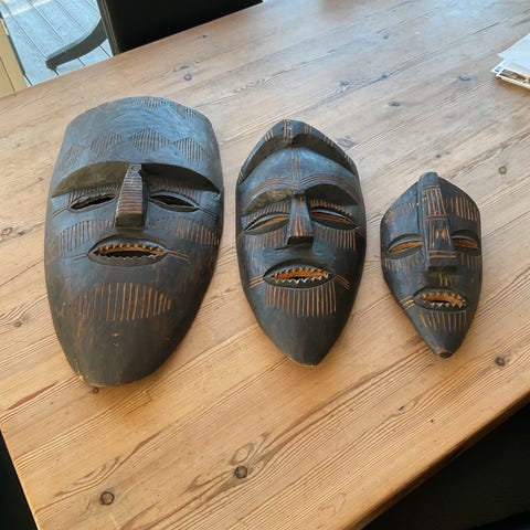 Hejsa, sælger et sæt af træmasker i forskellige størrelser og designs.
