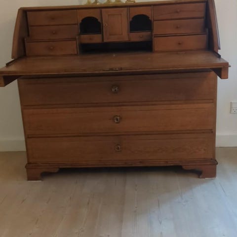 Malet træ, mangler 1 liste, nogle knopper i skufferne. H.106 B.92 D. 64 + klap 40 cm.
