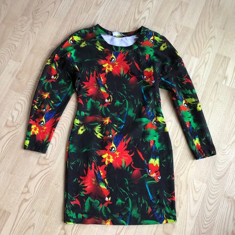 Boutique Moschino kjole i størrelse 42, sort farve med striber i flere farver. Fremstillet af bomuld 85 % og poliamide 15 %.