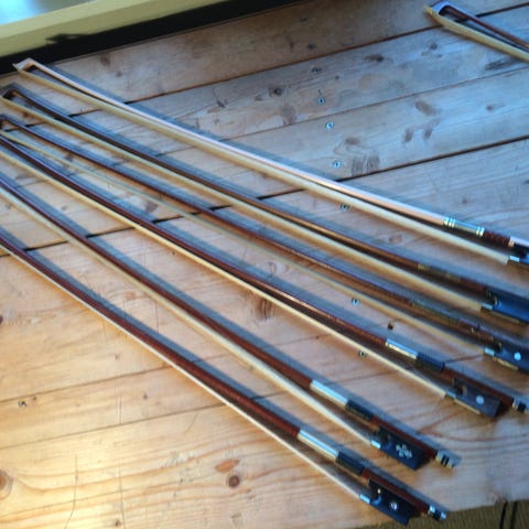 Fin, gammel violinbue. Buen er fremstillet af træsorten pernambuco, som traditionelt anvendes til buer til strygeinstrumenter, da træsorten er specielt god hertil. Pernambuco (brasiltræ) har sit navn efter den nordøstbrasilianske delstat af samme navn. Brasilien planlægger at beskytte træsorten mod udnyttelse på samme måde som elfenben. Buen er I fin stand og selvfølgelig forsynet med hestehår. Spidskappen er I ben eller elfenben og frøen er I ibenholt og udsmykket med indlæg af perlemor. Buen står på Mols men kan gratis leveres I Aarhus og Ebeltoft eller sendes billigt på købers regning