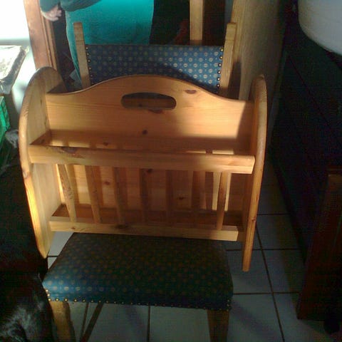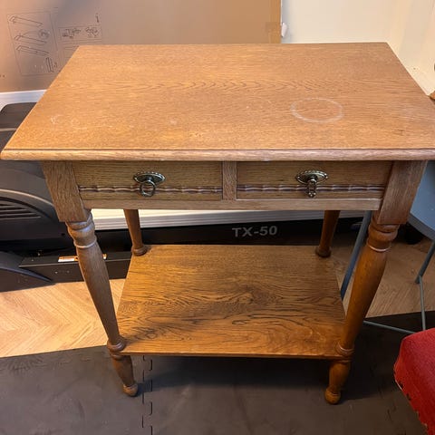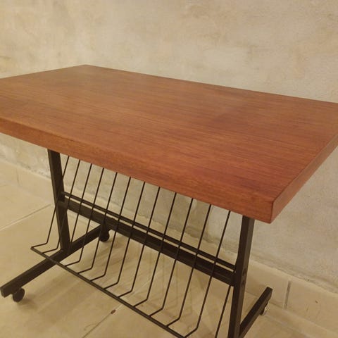Træbord med indbygget magasinholder. Bordet har en robust konstruktion og er velegnet til opbevaring af magasiner eller aviser under bordpladen. Fyr træ. Højde 52, længde 55, dybde 37