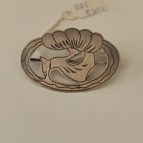 Fin sølvbroche (925) med indfattet slebet ravstykke sælges.