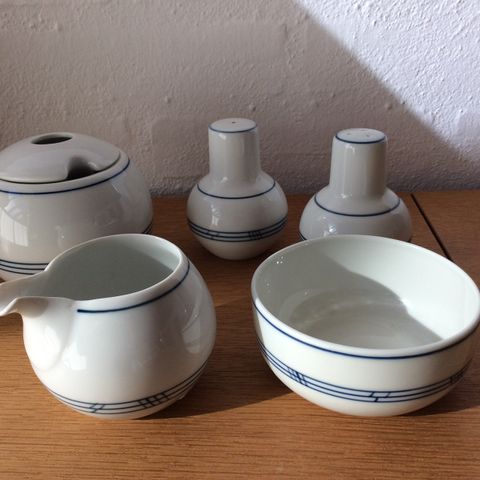 B&G Delfi: Kraftigt hvidt porcelæn med mønster med blå streger, som Olympia, form 43..