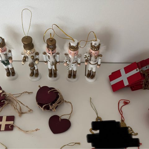 Juledekorationer bestående af tre nøddeknækkere i forskellige farver og uniformer. Dekorationerne er designet til jul og kan bruges som ophæng eller bordpynt. 12 cm høje