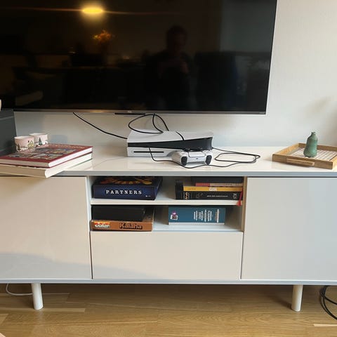 Der følger skabe med, men de er ikke fastmonteret til selve bordet. Standen er god, og alt fungerer som det skal. Spørg endelig hvis du vil have flere billeder eller mål.