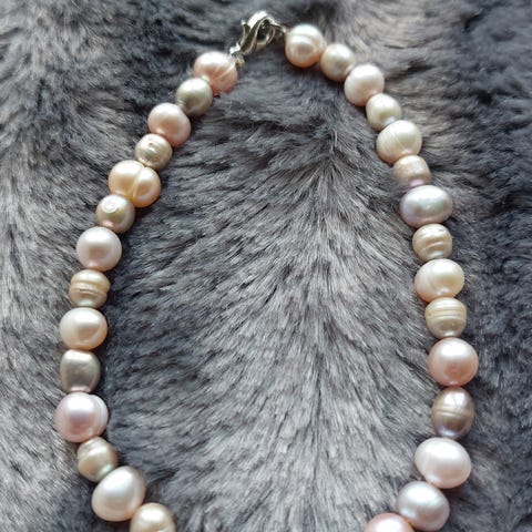 Smuk ferskvands perlekæde og armbånd i sarte farver. Kæde 46 cm lang. Armbånd 20 cm lang. Sælges som sæt.