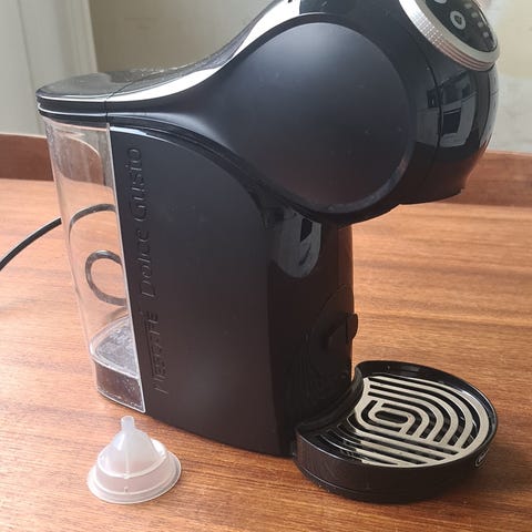 Dolce Gusto Genio S (grå), afkalket, rengjort og klar til brug. Der medfølger en halv kasse kaffekapsler.