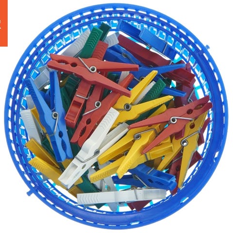 Farverige plast tøjklemmer i praktisk kurv. Perfekt til vasketøj eller som ekstra sæt.