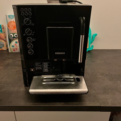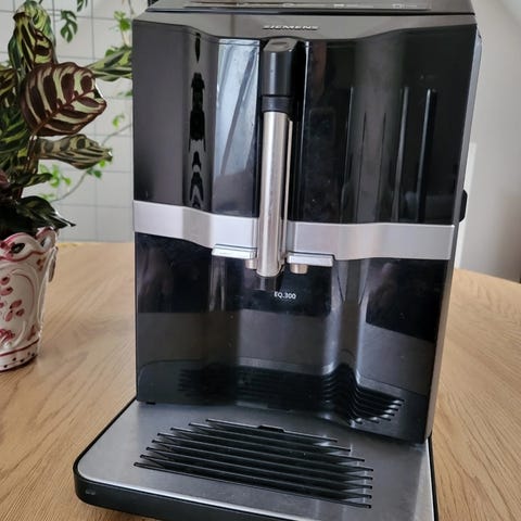 Siemens EQ.500 Classic kaffemaskine med integreret display og flere bryggemuligheder som espresso, caffe crema og cappuccino. Maskinen har et kompakt design i sort og grå farve, egnet til hjemmebrug. Fungere upåklagelig