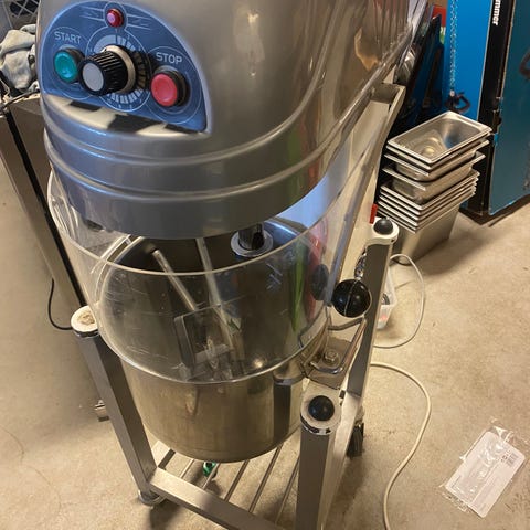 A.J. AR10 køkkenmaskine med rustfri stål skål. Maskinen er designet til blanding og æltning og leveres med flere tilbehør, herunder piskeris, dejkrog, Rørearm, derudover kødhakker. Bruger 16 ampære/ stærk strøm