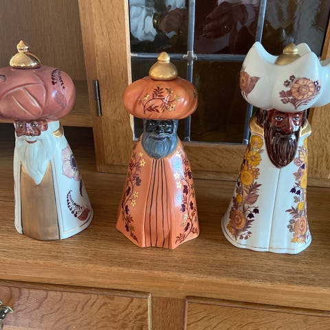 Flotte figurer, Hellig 3 konger, designet af Mads Stage 1985, hele og fine, med aftagelig top, så de kan bruges som lysestage , H 22-23 cm, SE FOTO