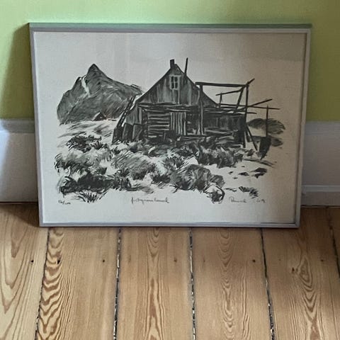 "Om den" er lavet af norske kunster Ragnar Oluf Hauge. Med rammen fylder det cirka 88x114cm.