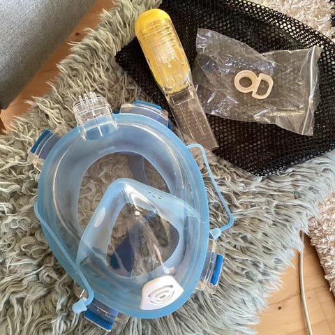Easybreath snorkelmaske i blå farve med integreret snorkel. Masken dækker hele ansigtet og har justerbare stropper for bedre pasform. Velegnet til snorkling og fritidsbrug i vand.