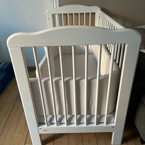 Der følger 2 babydyner, en baby-sovepose med ærmer (der kan lynes af) str 90cm, og en hvid IKEA sengerand med. Sælges uden madras. Køb det hele for 50 kr.
