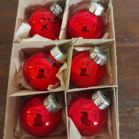 Gamle julekugler I æske. Håndmalede glaskugler I original æske.