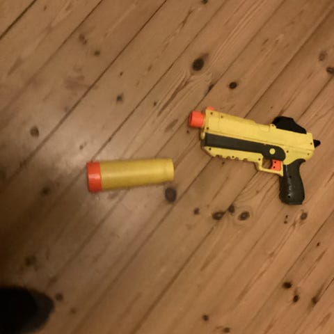 Fortnite legetøjsgevær i gul og orange farve. Fremstillet af plastikmateriale. Designet til leg og underholdning.