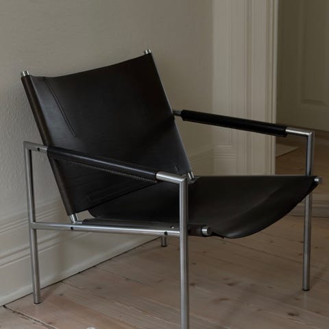 Design By Us stol i sort læder med quiltet ryg. Stolen har træben med klassiske detaljer og mål på 60 cm i bredde, 70 cm i højde, SH 46 cm. Ny pris DKK 14.700