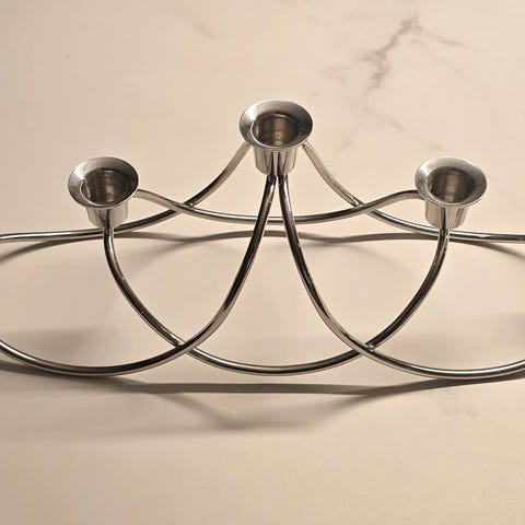Georg Jensen lysestage med tre holdere til stearinlys. Fremstillet i metal med blank finish. Designet til at holde tre lys, egnet til dekoration og belysning.