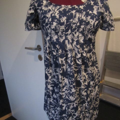 Esprit hverdagskjole i størrelse L. Kjolen er multifarvet (sort og hvid). Materialet kan muligvis være bomuld, men det er uvis. Den har korte ærmer og en rund halsudskæring.