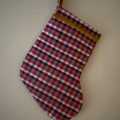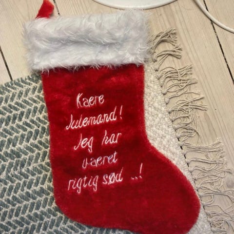 Stor Julesok i flot mønstret stof med for af råhvidt stof samt strop til ophæng.