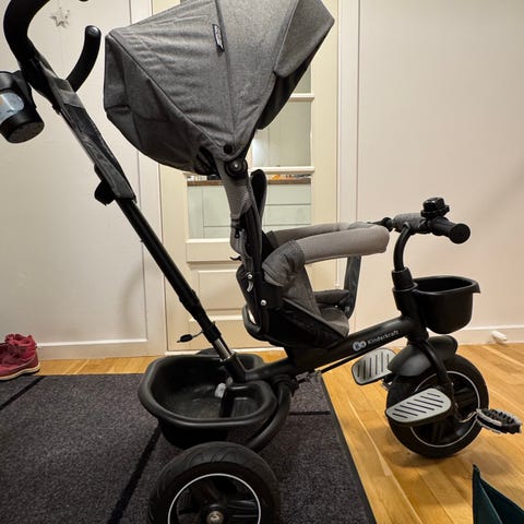 Hej vi ønsker at sælge vores søns Aston trehjulet cykel fra Kinderkraft med et justerbart forældrehåndtag. Den har en stor, aftagelig kaleche og et vendbart sæde. Den trehjulede cykel har en fempunktssele for maksimal sikkerhed, et ryglæn og en fodstøtte. Den har en rummelig kurv bagpå til sikker opbevaring af fx legetøj på turen.