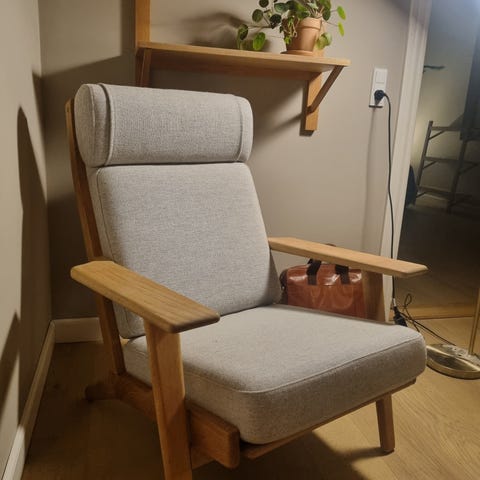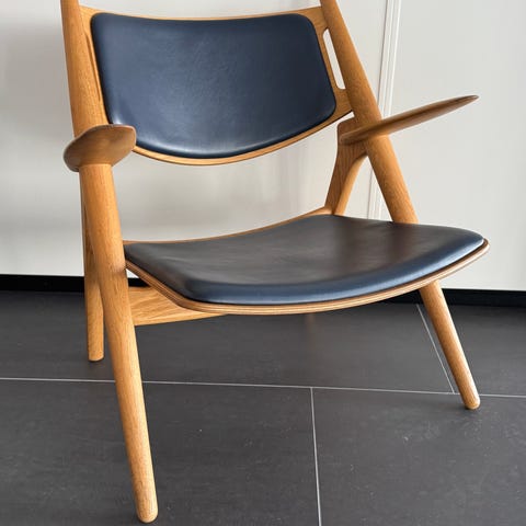 Hans J Wegner Stol med træramme og sort polstring. Designet af Hans J Wegner, kendt for funktionelt og æstetisk møbeldesign. Stolens materiale og farve gør den velegnet til forskellige indretninger. Massiv amerikansk valnød og sort læder