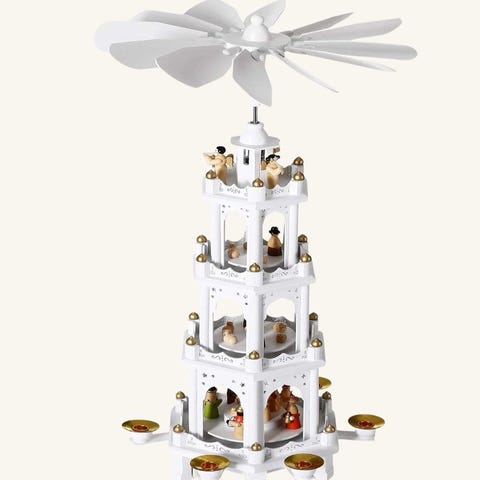 De smukt udskårne pyramider blev oprindeligt skabt i Erzgebirge-regionen, kendt for sit unikke håndværk og fine træarbejde. Inspireret af naturens former og julenattens symbolik blev de brugt til at lyse hjemmet op i vintermørket og skabe en varm og festlig atmosfære. Plads til seks kertelys, der får karrusellen til at dreje rundt.