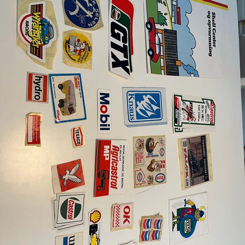 Samling af vintage bilreklamer og etiketter fra forskellige mærker som Esso, Shell, Mobil, Dunlop, Castrol og flere. Indeholder forskellige designs og størrelser, primært trykt på papir, til samlerformål.