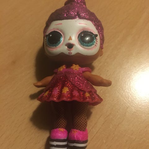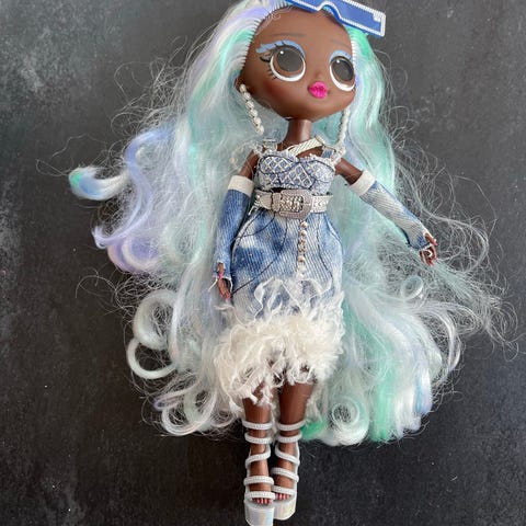 LOL Surprise OMG dukke med sort og hvidt tøj, inkluderer solbriller, kop med låg, og stativ. Dukken har tofarvet hår i hvid og pink, og bærer sorte sko. Passer til samling eller leg.