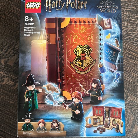 LEGO Harry Potter Hogwarts Magical Trunk legetøjssæt med detaljeret Hogwarts-tema, herunder figurer og tilbehør. Sættet har en bogformet opbevaringskasse i lilla og guld, der åbner til et miniature Hogwarts-scene med møbler og rekvisitter.